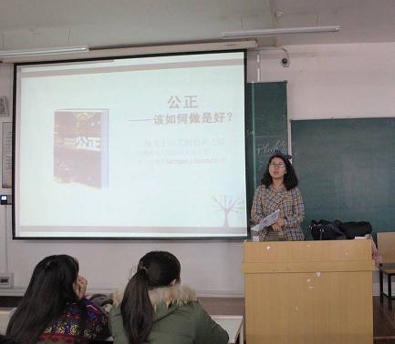 赵老师首先用书中的两个实例引出本次推介书目和这本书的核心思想,让学生明白结果主义的道德推理和绝对主义的道德推理的区别。她认为在这个日益物质化的年代,人们的行为选择总在人性与物质性之间摇摆不定。在思考什么是公正,如何做到公正。这本书可以启发你带你去思考,然后慢慢的悄然的改变你的思想,你的行为。