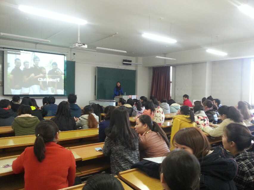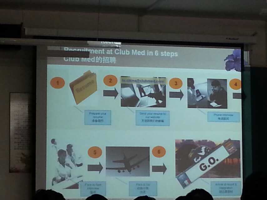 在招聘会上,来自Club Med公司的Ruby和Ray首先向大家介绍了该公司的概况,来自法国的Club Med成立于1950年,是目前全球最大的旅游度假连锁集团,一共拥有遍布全球5大洲30个国家的80多座度假村,其醒目的海神戟标志已经遍布全世界最美丽的角落。仅在亚太区,截止到2015年5月份就拥有13座度假村。Club Med坚持友好、自由、快乐、分享、开放的理念,在国际上享有极高的名誉。接着,Ruby和Ray向2013级全体毕业生提出了招聘政策:要求旅游管理专业的同学,并给招聘成功的同学许以丰厚的薪水和福利。