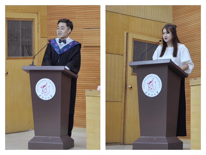 随后,2014级旅游管理专业吴俊龙同学代表毕业生向母校和学院的培养表达了最诚挚的谢意。吴俊龙同学通过自身实际经历表达出了同学们在大学四年的收获和成长,在感谢学校和学院对学生指导、呵护的同时,祝福全体毕业生能够秉持黑大精神,成为立大志做大事的优秀青年,前程似锦;祝福学院桃李满天下,祝福黑大各项事业蒸蒸日上。学院学生会主席王心男同学代表在校生向即将离开母校的学长、学姐们表达了衷心的祝贺及美好的祝愿。
