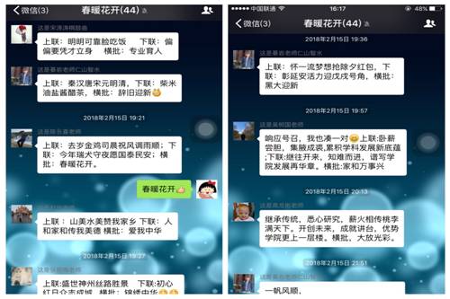 根据教师实际需要拓展活动形式,达到广泛参与的目的。2018年2月15日农历除夕夜,历史文化旅游学院党总支与工会联合举办学习十九大“迎新春 作春联”活动。活动在学院教师微信群“春暖花开”平台中开展,学院教职工积极踊跃的参加了此活动。虽然是除夕欢聚夜,活动并没有受到丝毫影响,老师们纷纷以饱满的热情参加“迎新春作春联”活动,积极上传自己的原创对联。对联的创作结合专业及国家时事,真实的展示出了教师们对十九大学习的独特心得和对祖国日新月异新变化的歌颂与赞叹,发出了自己对高等教育发展新趋势明朗前景的无限感慨。