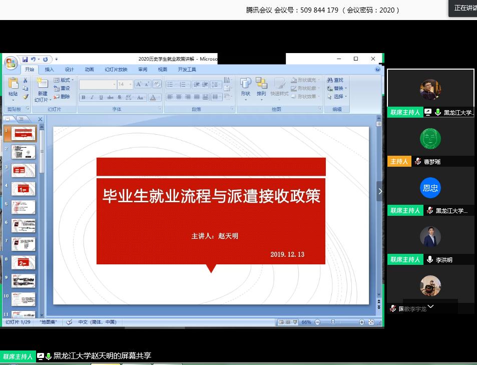 贯彻落实疫情期间就业工作的相关要求,帮助2020届毕业生了解就业过程中的相关流程及派遣报到政策,3月31日,历史文化旅游学院传播学院国际文化教育学院联合举办线上就业指导讲座此次讲座邀请到的是黑龙江大学招生就业指导中心就业指导部主任赵天明老师担当主讲,讲座题目为《毕业生就业流程与派遣接受政策》