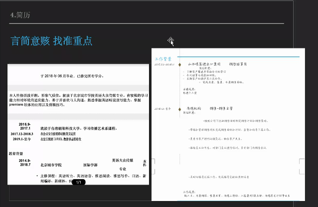 接下来,刘喆学姐向同学们介绍了面试的基本流程并分享了一些实用的面试技巧,她着重强调了面试中自信心的重要性,建议同学们在面试时要突出实际,有所侧重,不要空谈理想。对于简历制作,刘喆学姐用自己在招聘过程中收到的两份简历进行比较,向同学们展现了简历制作中语言表述的重要性,她建议同学们制作简历要言简意赅,找准重点,突出与目标职业相关的部分。