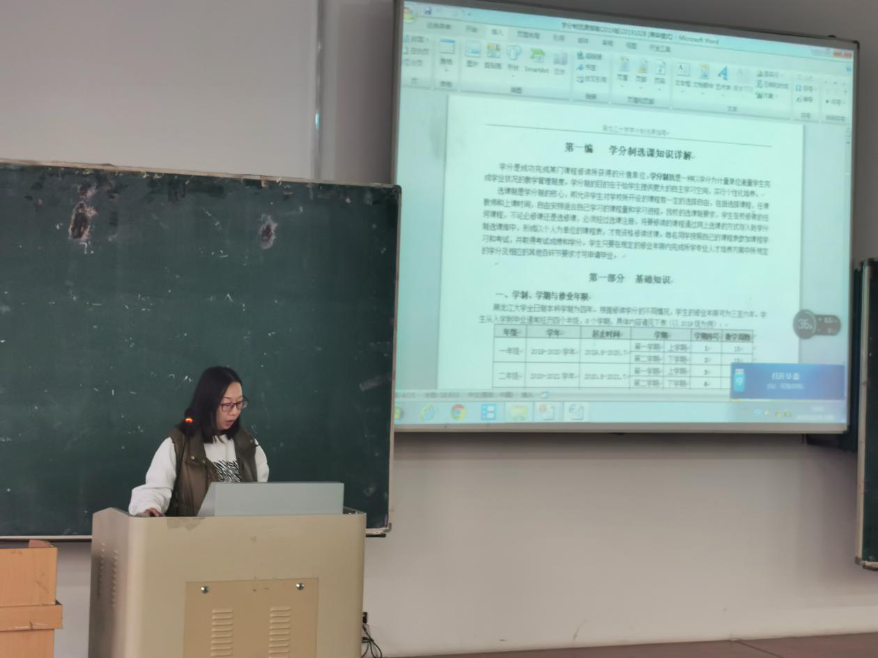 然后,学院教务员李琼老师为同学们进行选课培训,李琼老师详细介绍了我校的选课制度,她希望同学们能合理利用选课积分,学会使用校园应用门户等线上平台,顺利完成每学期的选课任务。