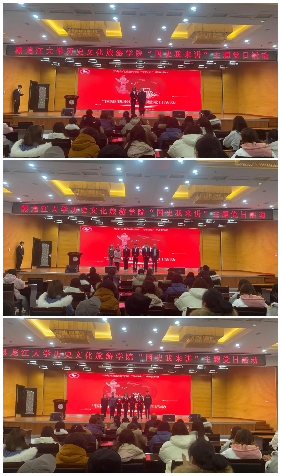 为引导学生党员深入学习党史、新中国史、改革开放史和社会主义发展史,做到知史爱党、知史爱国,进一步了解党的光荣传统和伟大成就,11月23日晚,历史文化旅游学院在主楼一楼报告厅举办2020年“国史我来讲”主题党日活动。学院党委书记赵恩忠老师,学院党委委员、旅游管理专业系主任张丽梅老师,历史学专业系主任綦岩老师,学院学生第一党支部书记杨淦老师,学院学生第一党支部宣传委员曹梦瑶老师,学院学生第二党支部书记张斯博老师,学院学生第二党支部纪检委员赵鑫宇老师担任评委,学院全体学生党员,2018、2019级、2020级入党积极分子观看比赛。