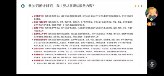 赵鑫宇对2024年大学生志愿服务“西部计划”政策进行解读,从工作内容、政策支持、资金保障、报名流程四方面出发,细致讲解了“西部计划”志愿者的福利待遇及工作内容,并积极动员广大学生参与其中,为国家战略的实施贡献青年一代的力量。