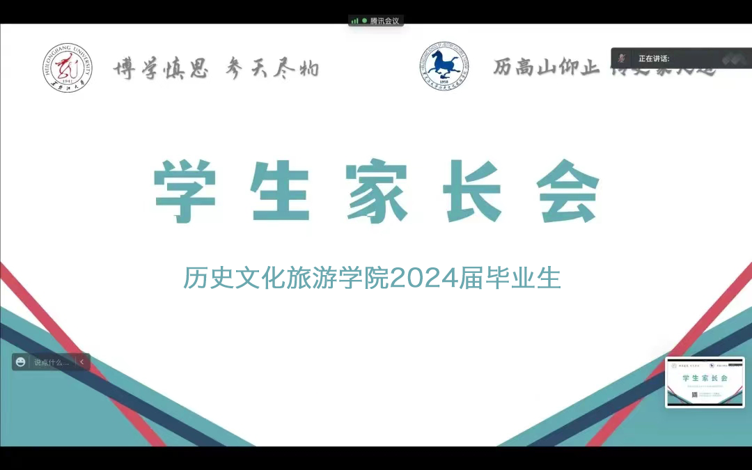 为扎实做好毕业生离校教育工作,贯彻落实《学生工作部:黑龙江大学2024届毕业生离校教育活动方案》通知要求,保证2024届毕业生离校相关工作顺利进行,历史文化旅游学院于6月20日晚召开2024届毕业生家长会。本次会议由学院毕业生辅导员赵鑫宇老师主讲,2024届毕业生家长参会。