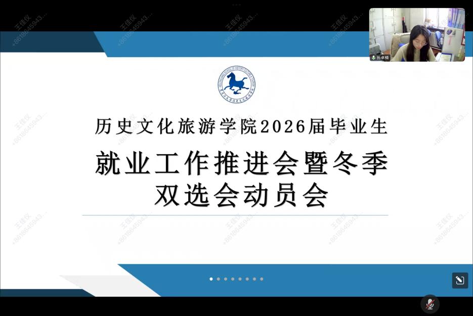 为扎实推进2026届毕业生管理工作有序开展,帮助学生明确毕业流程,把握就业形势,自觉筑牢假期安全防线,历史文化旅游学院于12月22日11:00在腾讯会议召开2022级年级大会暨冬季双选会动员会。本次会议由2026届毕业生辅导员孙卓楠主持,全体2026届本科毕业生参加。