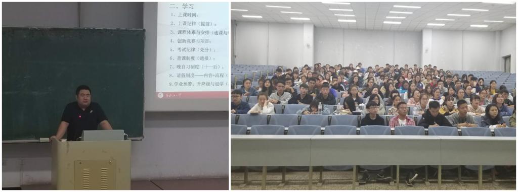 会上,曹梦瑶老师首先对全体2018级新生的到来表示热烈的欢迎,并简单介绍了学院历史发展沿革、学生工作情况,并风趣幽默地进行了自我介绍,嘱咐全体新生努力学习,奋勇拼搏,尽早适应和享受大学生活。然后,曹梦瑶老师从寝室、军训、学习、校园文化等各方面向新生做详细介绍,为新生解读了学业预警制度和在2018级全面推行的德育学分制度,并着重强调了军训的各项要求,要求大家服从命令,听指挥,安全、顺利、有收获地度过军训时光。此外,曹梦瑶老师着重强调了校园安全问题。他以实例向新生们介绍了寝室防火防盗、网络诈骗、校园贷等各类不安全因素,呼吁全体同学要提高警惕,保护好人身财产安全,度过安全、健康的大学时光。