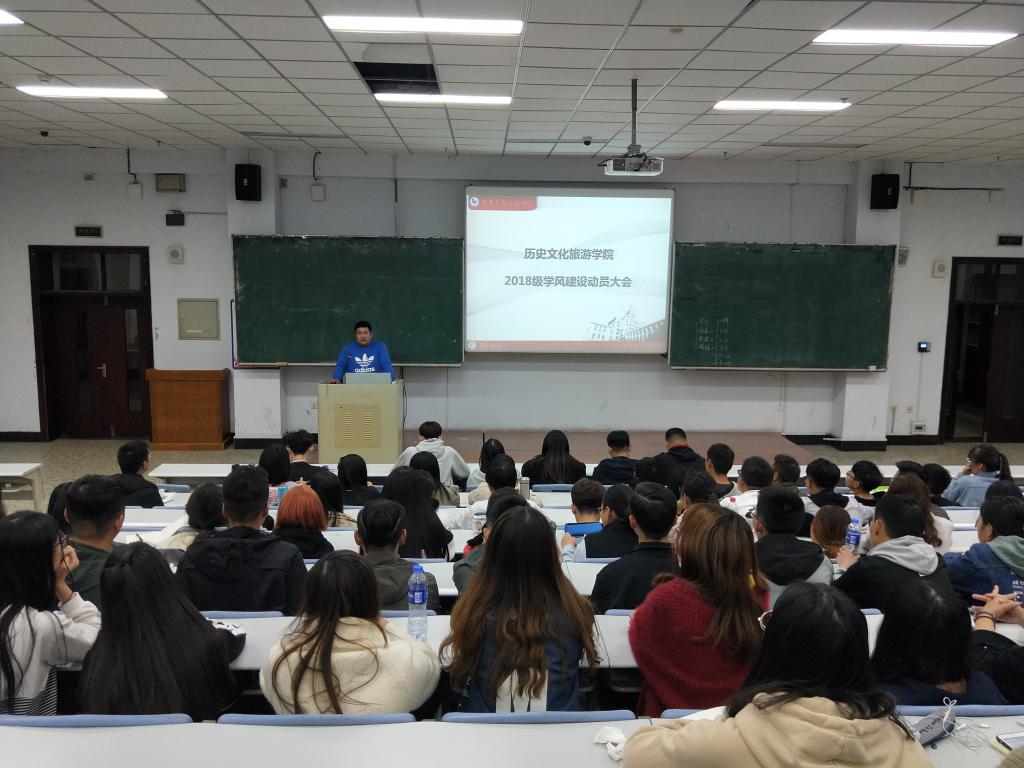 目前,2018级新生的大学生活已经正式步入正轨,各门课程的学习也紧张有序的进行着。为总结入学来学生学习状况,督促学生尽快适应大学学习状态,培养良好学习习惯,改善学习状态,加强学风建设,历史文化旅游学院于10月8日在汇文楼120教室召开2018级学风建设动员大会,会议由辅导员曹梦瑶老师主持,2018级全体学生参加会议。