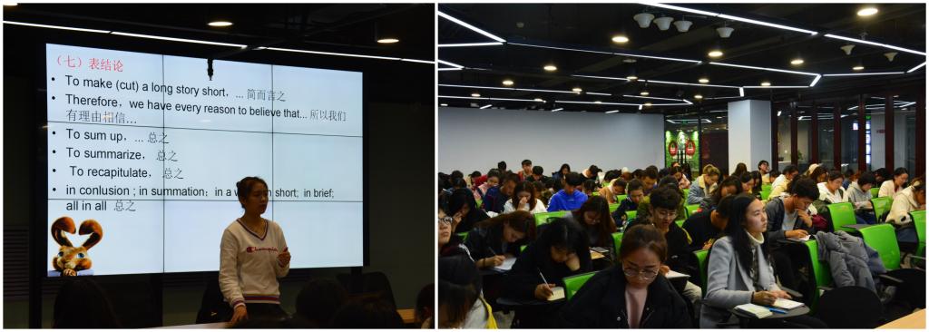 随后,吴昊同学为大家细致讲解了应试方面的技巧。她提醒大家要分析考试流程,明晰考试各个部分分值占比,明确四六级阅读三大关卡。在讲解过程中,吴昊同学以个人考试经验为基础,为大家准备了一系列答题技巧和方法,增强了大家四六级考试的信心。