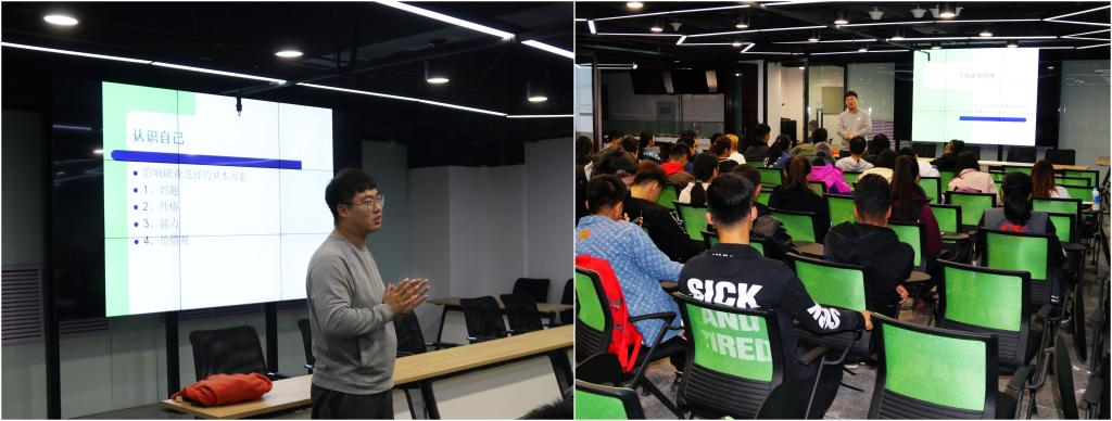在讲座中,卓越学长首先告诉大家要学会全面认识自己,明确职业选择。面对社会与求职,大家首先需要了解自己的兴趣,兴趣就像一个引路人,带领大家入门一个学科;其次是性格,性格无好坏,但很大程度地影响着人的发展轨迹。然后是能力,能力的大小将决定是否能胜任自己的工作,但能力可以后天培养,希望大家可以做一个综合、全面发展的人。最后是价值观,也就是追求,这将是决定职业选择最重要的因素。