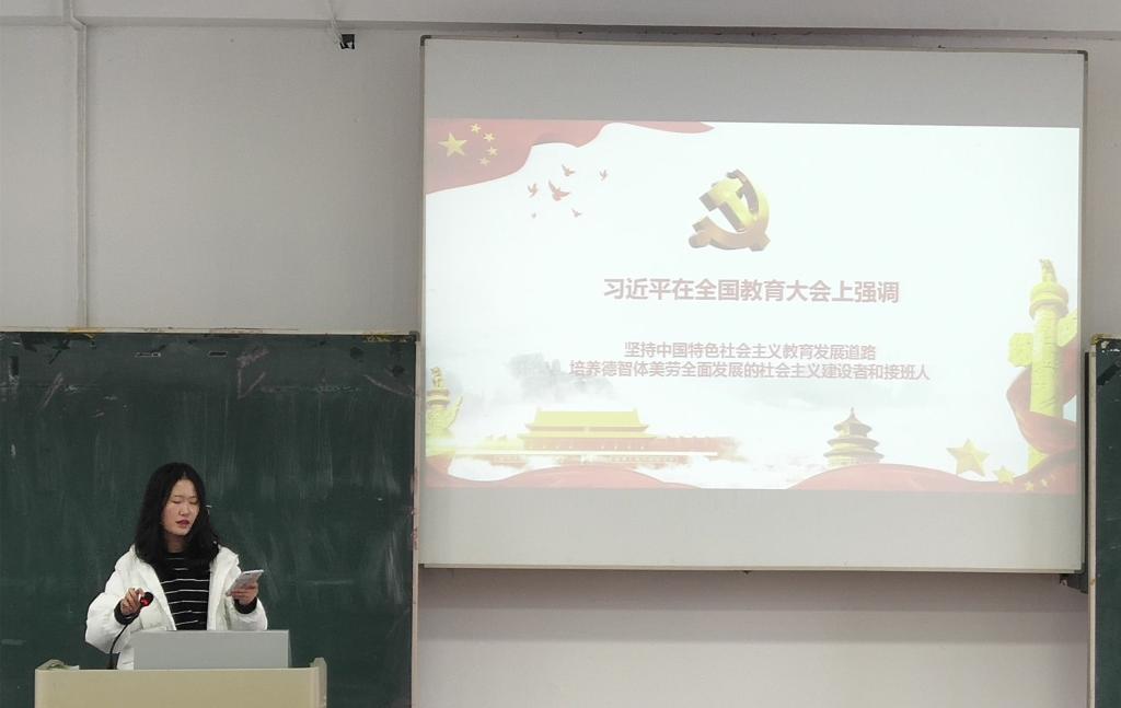 会上,学院学生团委副书记冯熙首先带领全体人员以习近平总书记重要讲话为根本,深入学习全国教育大会精神。她介绍到,当代大学生作为社会主义建设者和接班人要树立中国特色社会主义远大理想和共同理想,牢固树立“四个自信”,做好“九个坚持”,厚植爱国主义情怀,立志扎根人民,奉献国家。作为团学干部,大家要坚定理想信念,加强思想自觉和行动自觉,以各类校园文化体育活动、心理健康教育活动等为依托,加强网络与新媒体平台建设,培育和践行社会主义核心价值观,以文化育人、榜样育人和健康育人为抓手,为培养优秀社会主义建设者和接班人助力。