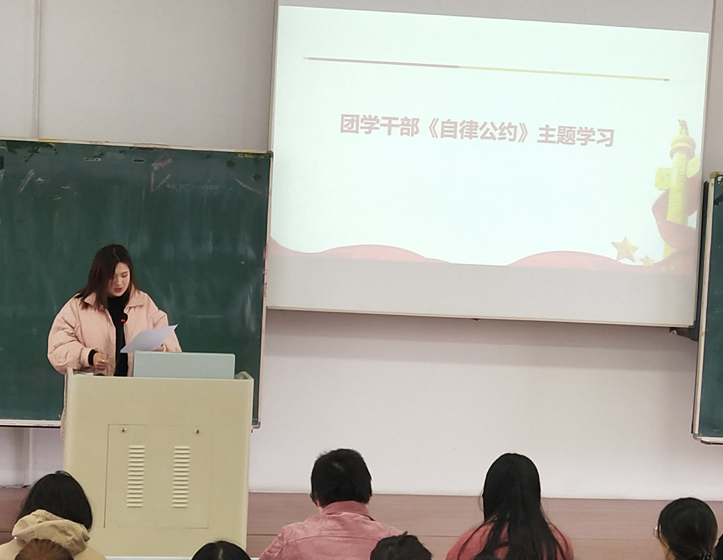 随后,学院学生会主席、2016级旅游管理2班团支书王心男代表学院全体团学干部宣读黑龙江大学团学干部践行《自律公约》承诺书,并带头签字。