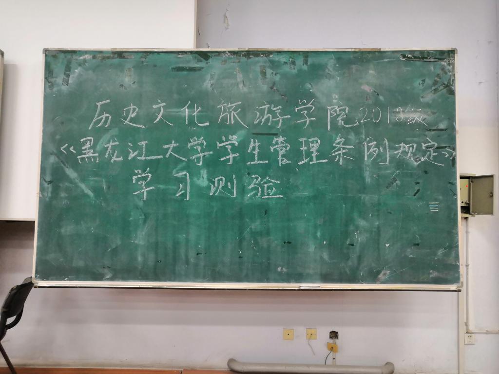 为进一步提高2018级新生纪律意识、规则意识,了解自己的权利和义务,明确大学中的高压线,加强学生自我管理、自我教育、自我服务、自我监督能力,在以年级大会、班会等形式深入学习学生管理规定的基础上,历史文化旅游学院于11月11日在汇文楼220教室举行《黑龙江大学学生管理规定》学习测试。