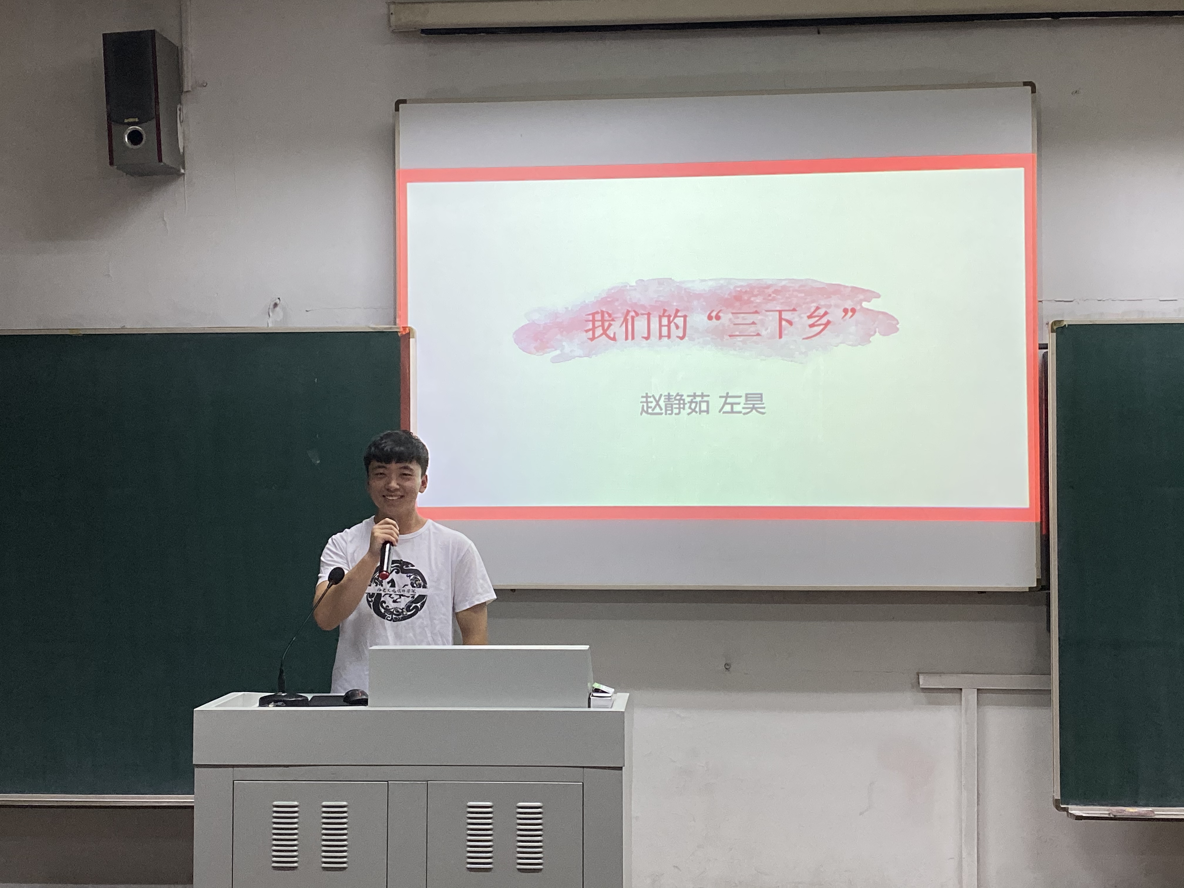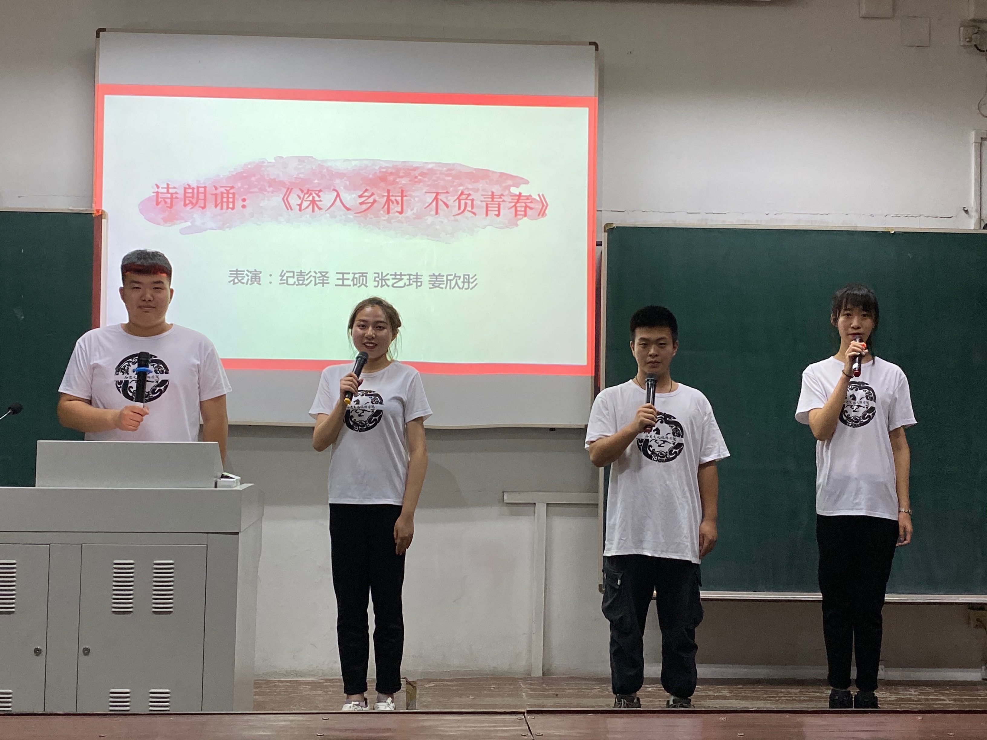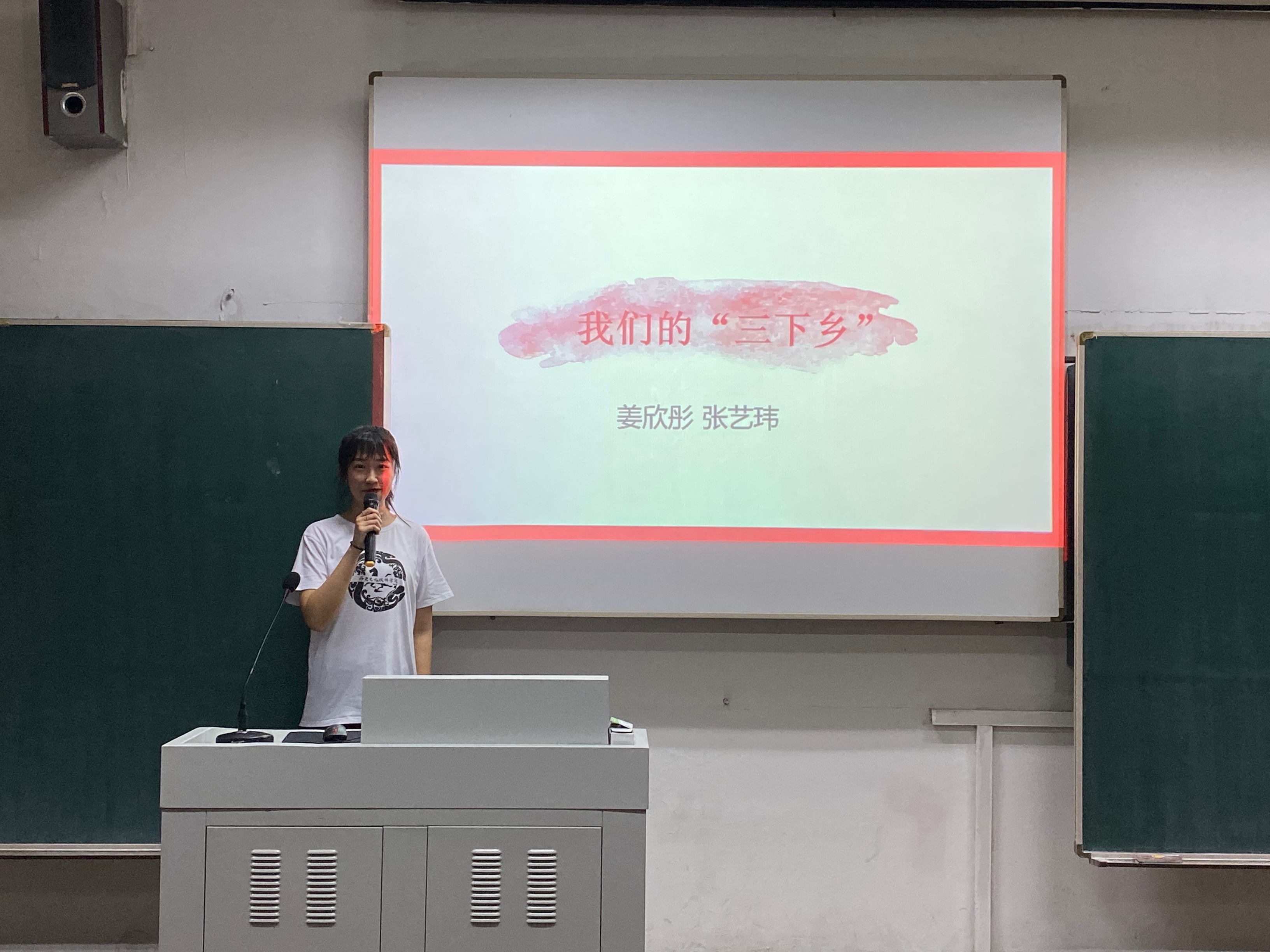 会议伊始,张艺玮同学通过PPT为大家详细介绍了本次活动的基本概况、实践活动的内容与成效以及媒体宣传报道情况。通过讲述,在场新生都对本次活动有了初步的了解。接着,赵静茹同学和左昊同学为大家演唱《夜空中最亮的星》,台下新生掌声连连,现场被迅速点燃。随后实践队成员分别上台向2019级的学弟学妹们讲述自己的实践经历及心得感悟。实践队员姜欣彤同学说到,本次社会实践让她认识到了团队合作的重要性,也懂得了自身的社会责任,更是切身感受到了国家惠农政策给农民带来的好处。接下来,实践队成员为大家带来了诗朗诵《深入乡村,不负青春》,在队员们激昂的朗诵下,新生们感受到青春的正能量。最后,在热烈的掌声中历史文化旅游学院暑期“三下乡”社会实践服务活动顺利结束。
