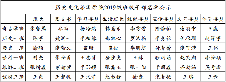 根据历史文化旅游学院2019级新生班级干部竞选学生自荐情况,通过班级测评、新生班主任测评、辅导员测评评定,最终确定以下结果。现将情况公示如下,公示时间:2019年10月12日—2019年10月14日,如有异议,请向辅导员反映,联系电话:86608246,张老师。