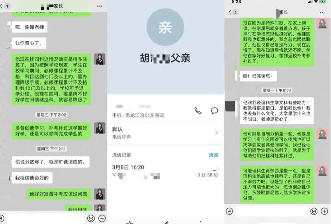 各年级辅导员老师通过电话、微信等形式与家长取得联系,将学生挂科情况如实反馈给家长,并与家长沟通学生在校学习状态,共同商讨帮扶措施和计划,学校多帮扶,家长多关心,加强学校和家庭沟通,形成育人合力。