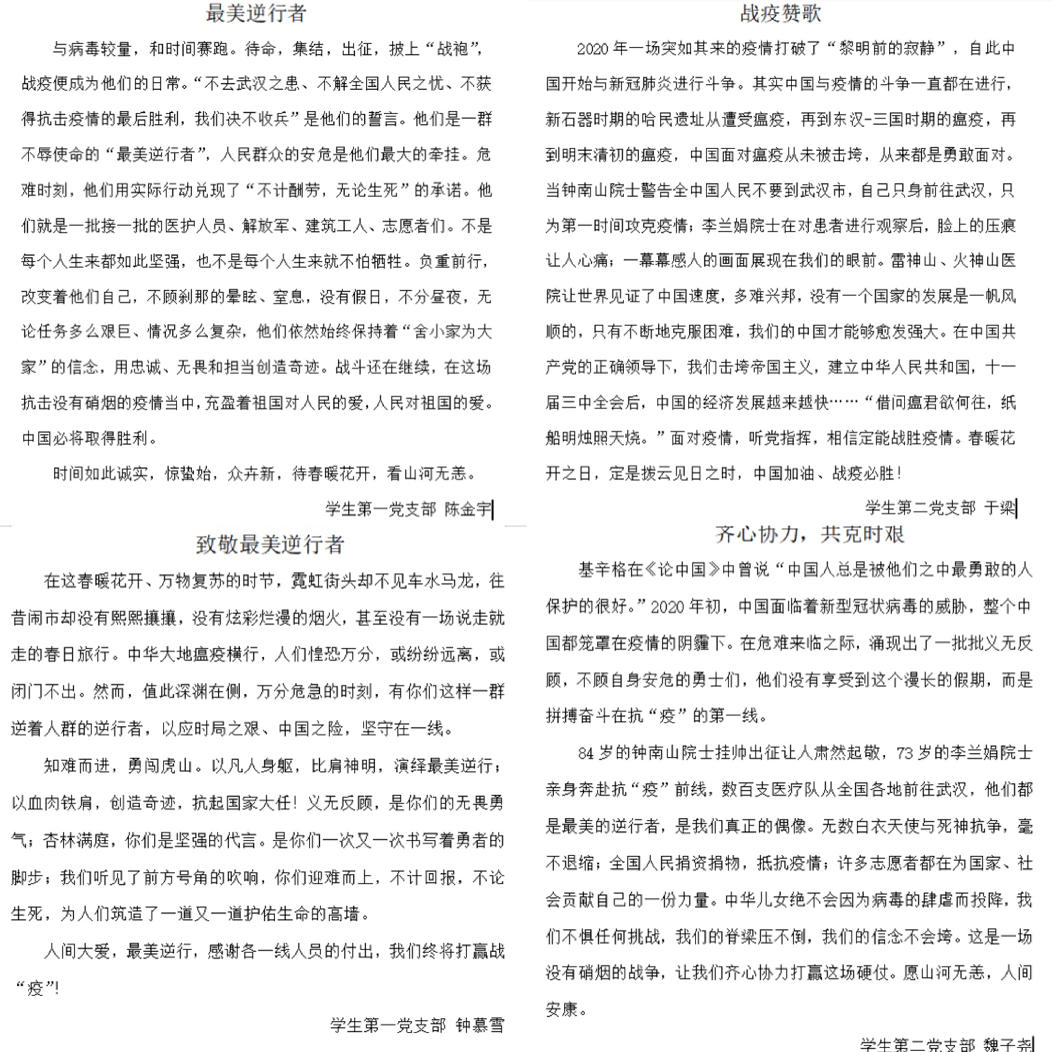 学生党员学习疫情防控救治中的先进人物事迹,以笔为援向战“疫”一线的平凡英雄们表达敬意向祖国表达热爱之情。