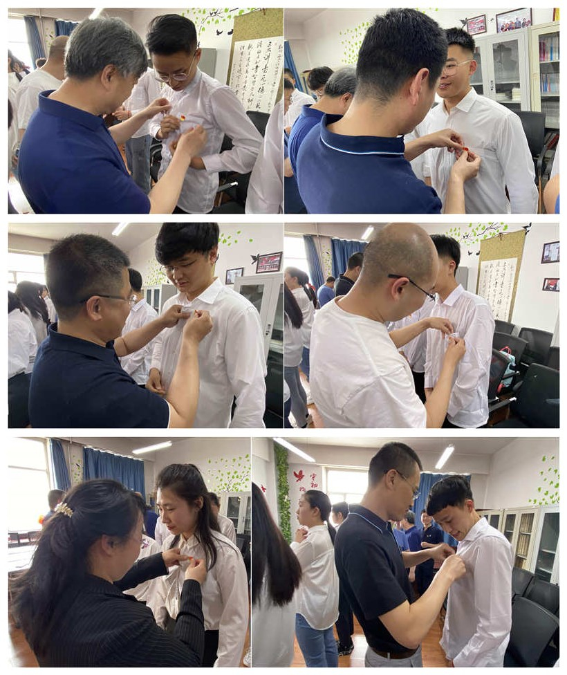党徽是身份的象征,更是责任与使命的象征。在陈长喜老师的带领下,教师党员为新发展党员逐一佩戴党徽,并对他们提出了更高的要求和希望。