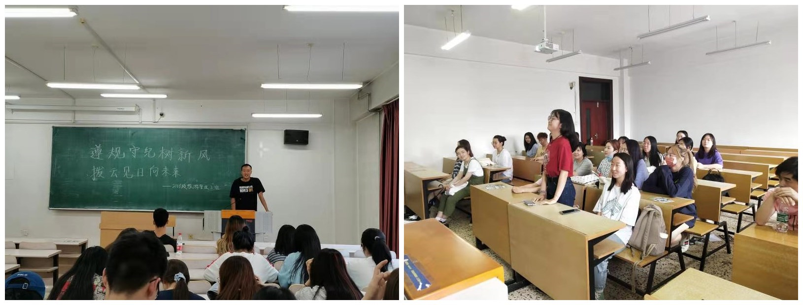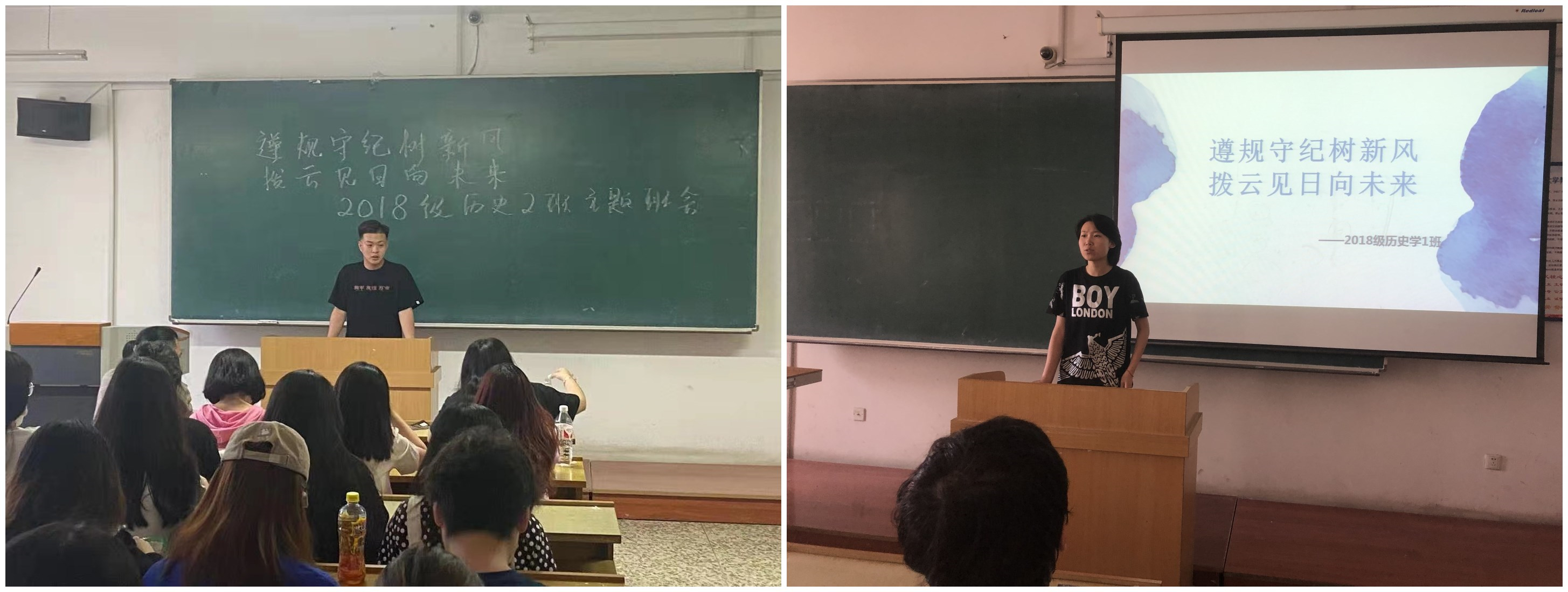 为引导广大学生进一步自觉遵守校规校纪,强化规则意识和纪律意识,明晰发展方向,规划个人未来,历史文化旅游学院2018级各班于6月11日至16日在汇文楼分别召开“遵规守纪树新风 拨云见日向未来”主题班会,本次会议会议由各班班长主持。