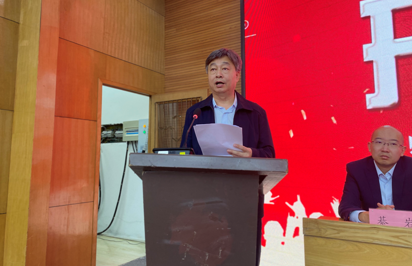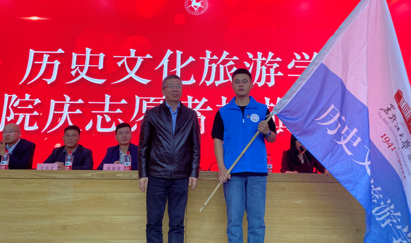 学院党委书记赵恩忠老师宣读《关于聘任历史文化旅游学院复系40周年庆祝活动志愿者的决定》,决定任命刘亮等30名同学为历史文化旅游学院复系40周年庆祝活动志愿者,并为志愿者代表授旗。