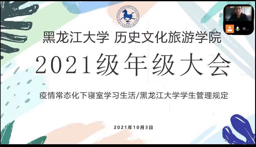 为全力推进新学期的各项工作,使新生更加了解黑龙江大学学生管理规定,加强疫情常态化下的学习、生活管理,维护学生身心健康。10月3 日13点30分,历史文化旅游学院在腾讯会议召开2021级年级大会——疫情之下如何安排自己学习生活,同时学习黑龙江大学学生管理规定。会议由2021级辅导员许春光老师主持,2021级全体同学参加。