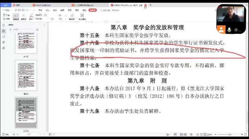 接下来,许老师带领大家一起学习了黑龙江大学学生管理规定。许老师向大家详细讲解了黑龙江大学本科生国家奖学金、励志奖学金和各类奖学金的评定办法和细则,黑龙江大学公寓管理办法,黑龙江大学学业预警管理办法等,希望大家仔细了解相关规定,严格遵守各项规章制度,同时鼓励广大同学努力学习,取得优秀学习成绩。