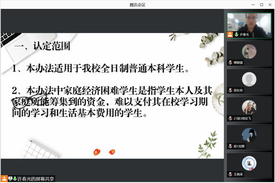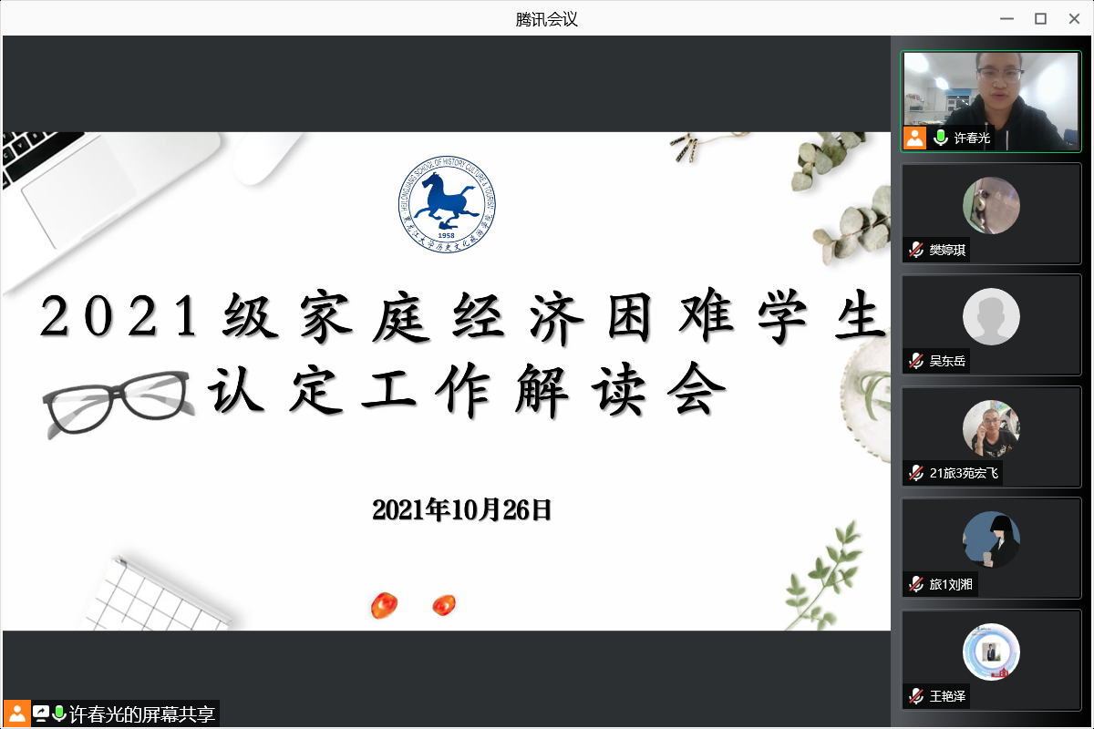 为做好2021级家庭经济困难学生认定工作,使资助工作更加公开、公平、公正,确保各项资助政策和措施能够真正落实到所有家庭经济困难学生身上,按照学校《关于开展2021级家庭经济困难学生认定工作的通知》要求,历史文化旅游学院分别于10月26日和 29日召开2021级家庭经济困难学生认定工作解读与评议大会, 2021级全体同学参加。本次会议由2021级辅导员许春光老师主持。