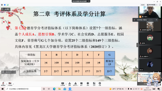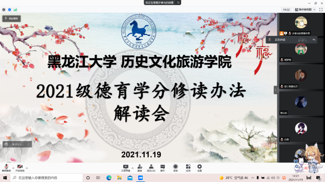 为贯彻落实《黑龙江大学本科生德育学分修读办法》(2020修订)和学院相关政策,切实做好大学生德育教育,帮助大学生全面发展,培养优良学风,坚定理想信念、锤炼坚定意志。历史文化旅游学院于2021年11月19日12:30在腾讯会议召开2021级德育学分解读会议。本次会议由2021辅导员许春光老师主持,2021级全体学生参加。