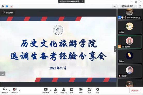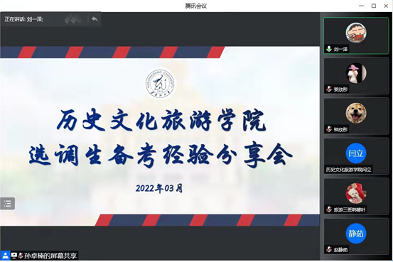 为落实好2022届毕业生毕业去向,增强毕业生就业能力,解决毕业生在选调生备考过程中面临的实际问题和疑惑,3月11日,历史文化旅游学院召开选调生备考经验分享会,邀请2021届毕业生刘一泽同学分享选调生备考经验。本次会议由2022届毕业生辅导员张斯博老师主持,2022届部分毕业生参加。
