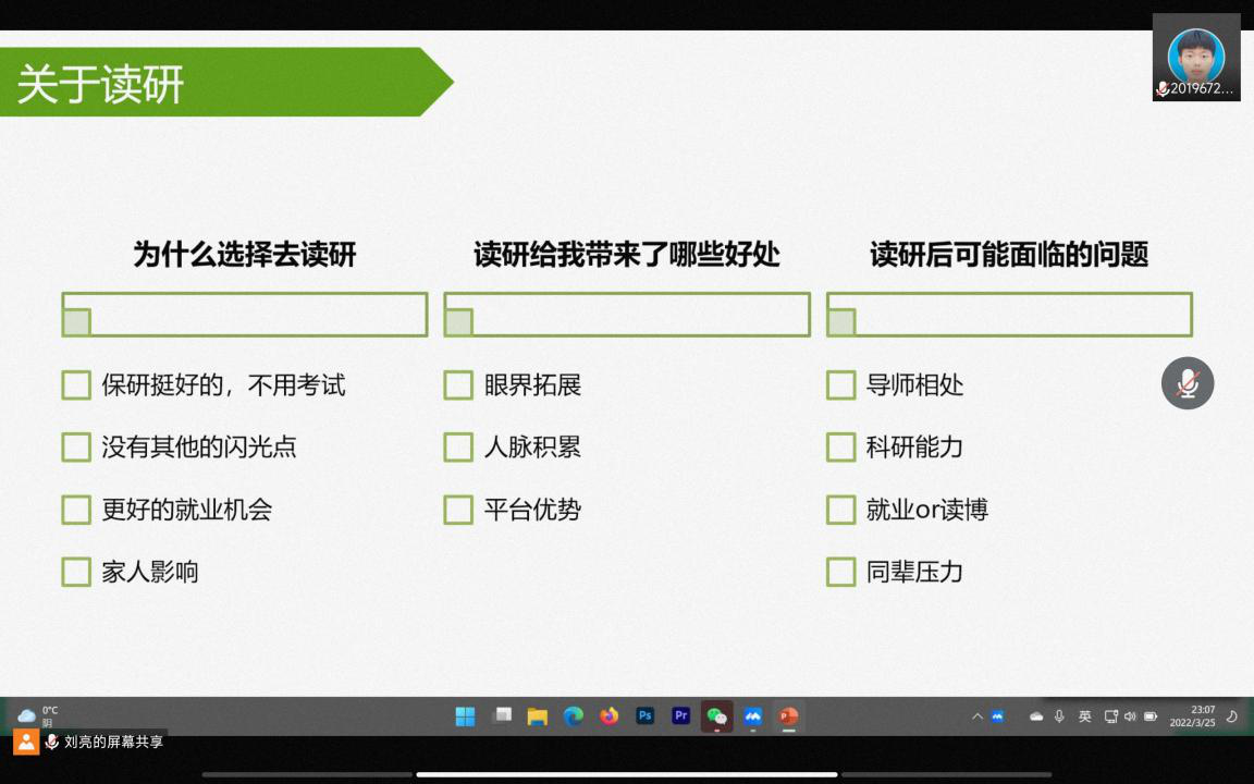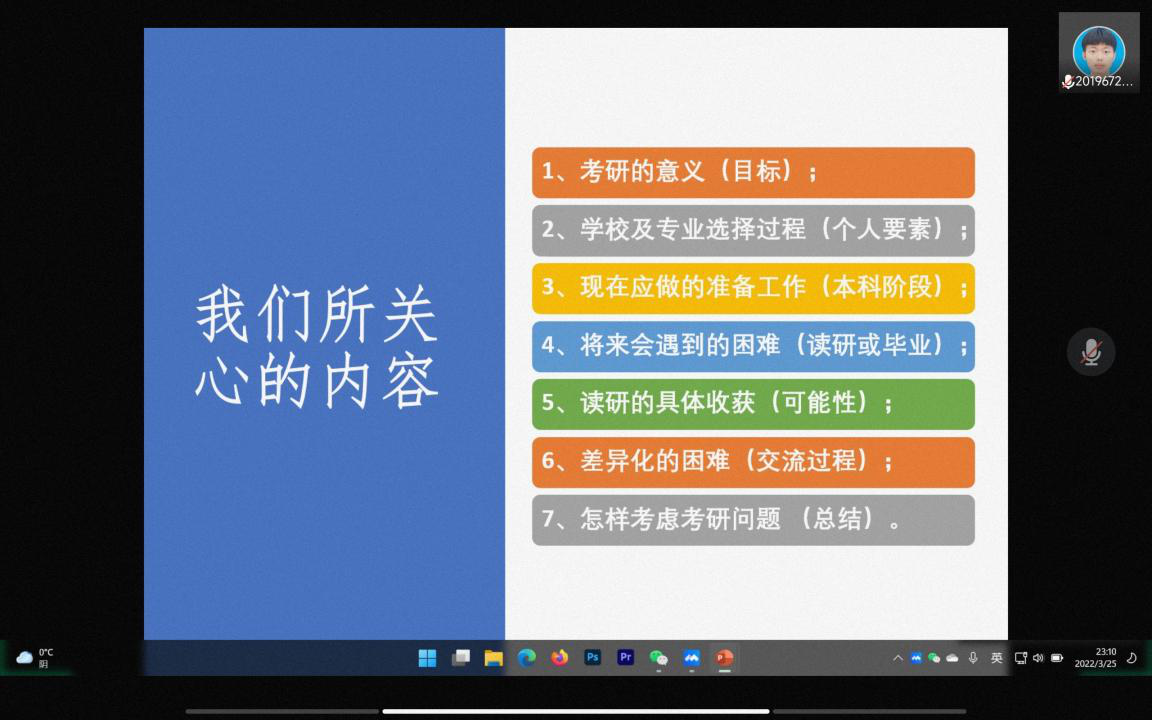 随后,本科优秀毕业生代表宋美懿、马颖、詹崔婧、王家乐、沙红霞、董莜哲、陈金宇以自身经历出发,分别在考研难度、意义,学校与专业选择,读研收获以及未来发展等多个方面向同学们进行了系统的分析介绍。也针对同学们提出的问题进行了详细的解答。