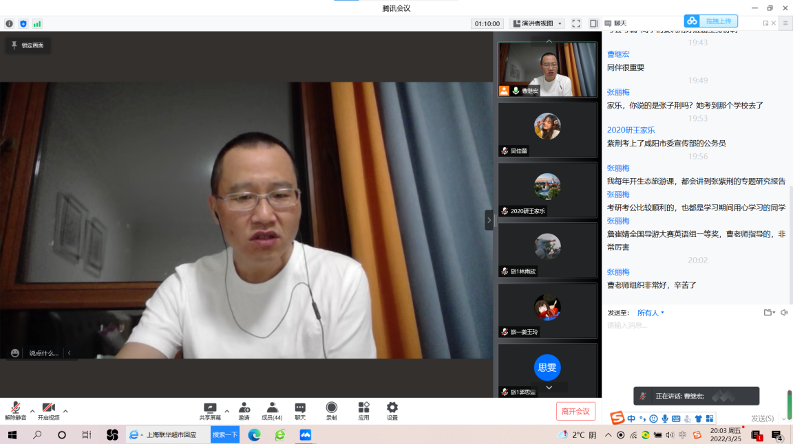为进一步加强学院学风建设,帮助考研学生选择更适合自己的专业与院校,为学生提供更精准的帮助,提高考研上岸率,督促学生提早做好职业及学业规划,历史文化旅游学院学生党支部于3月25日组织举办了“树人课堂•旅游管理专业考研辅导”主题讲座,本次讲座由曹继宏老师主持,旅游管理专业系主任张丽梅老师出席,学院2019级、2020级、2021级部分同学参加。