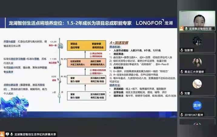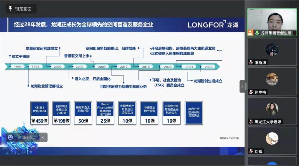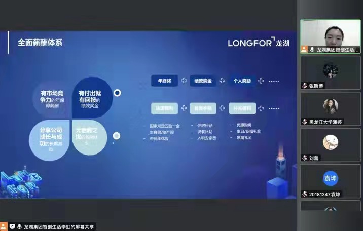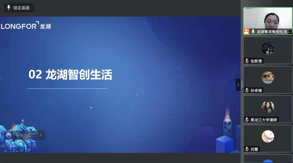 为进一步做好毕业生就业工作,拓宽毕业生就业渠道,落实好“稳就业”“保就业”相关部署,历史文化旅游学院、西语学院、文学院、教育科学研究院于3月31日18:00联合开展龙湖集团智创生活空中专场招聘会。本次会议由龙湖集团智创生活东北大区黑龙江地区人力经理李虹主讲,相关学院毕业年级辅导员老师王若杉、张斯博、张凯、梁曼、田一君出席,部分未就业毕业生参加招聘会。