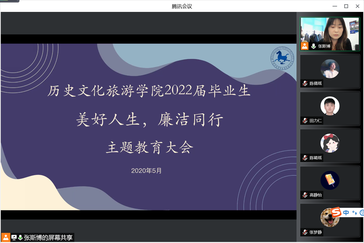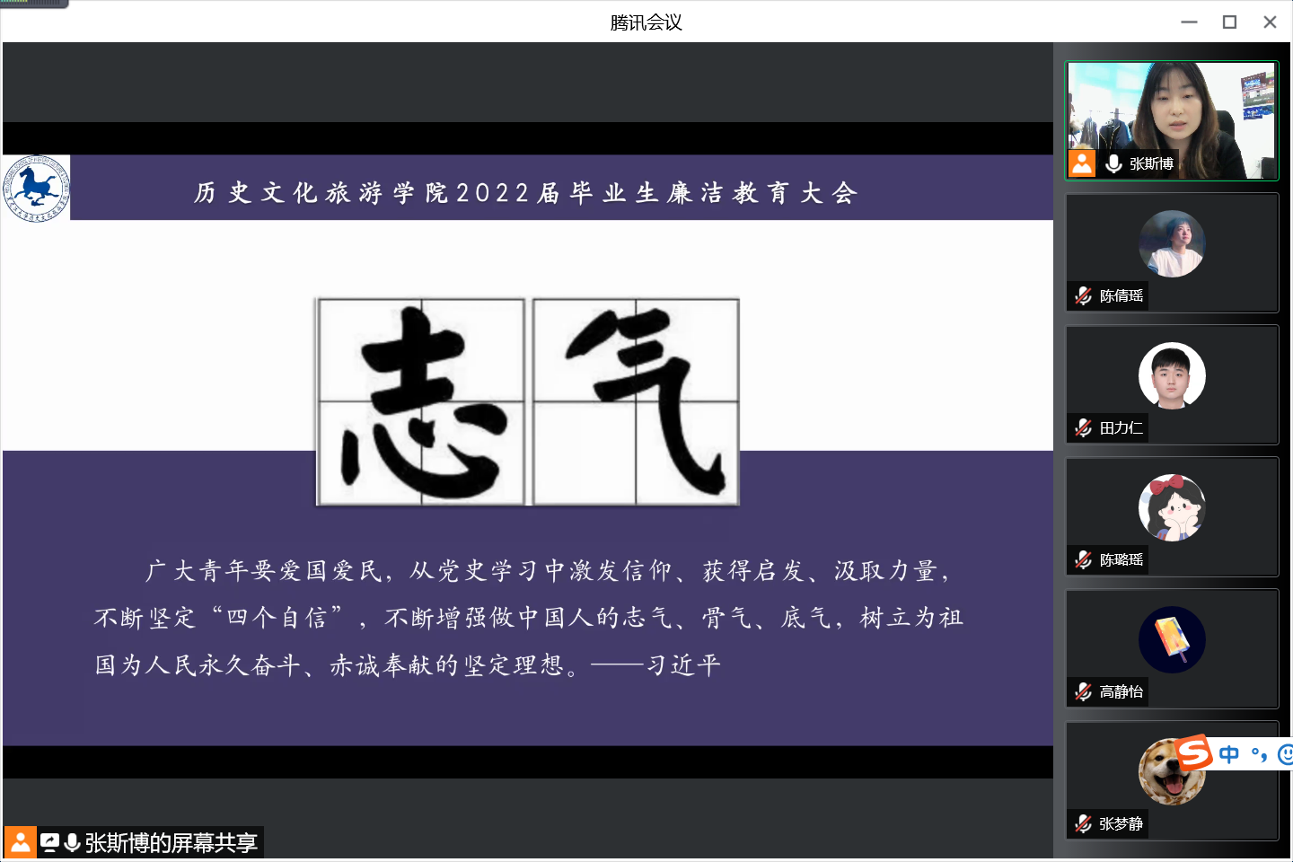 为深入学习贯彻习近平新时代中国特色社会主义思想,进一步加强毕业生的理想信念教育、爱国主义教育,确保2022届毕业生离校工作顺利开展,按照学工部2022届毕业生“十个一”主题教育活动相关要求,历史文化旅游学院于5月20日在云端召开“美好人生,廉洁同行”主题教育大会。会议由2022届毕业生辅导员张斯博老师主讲,2022届全体毕业生参加。