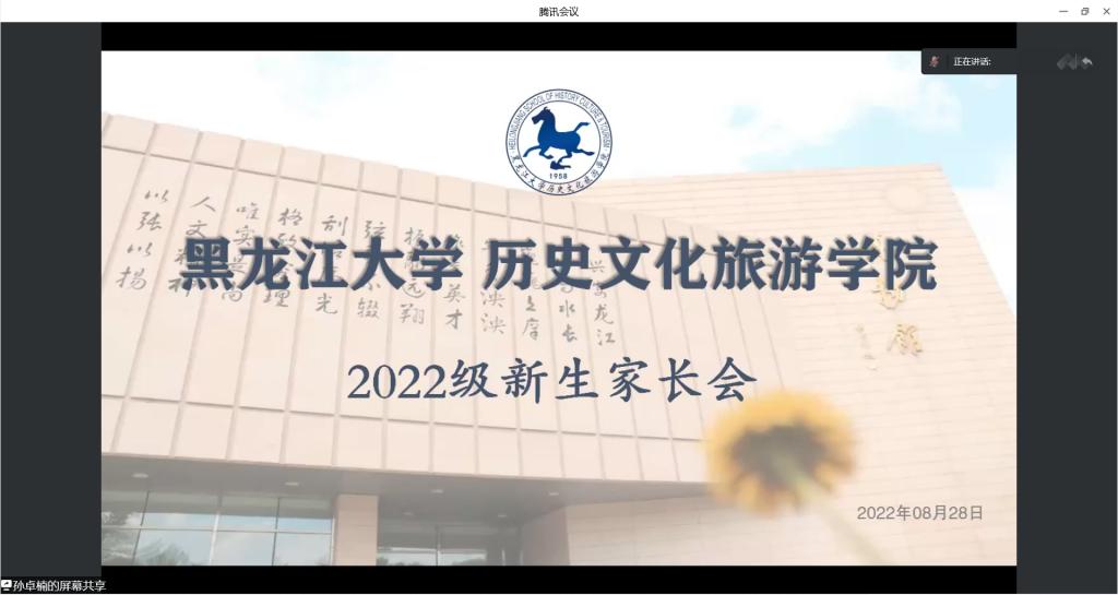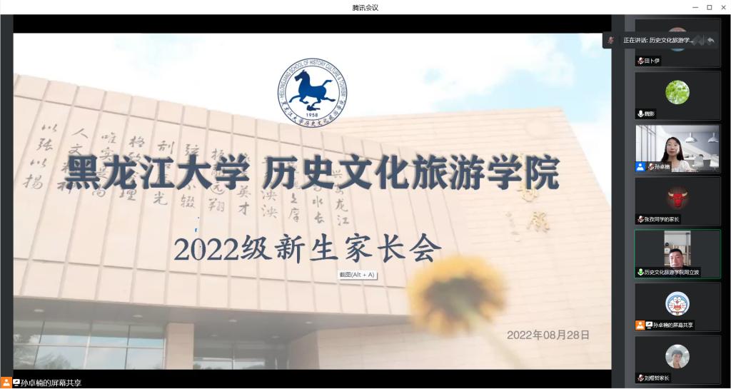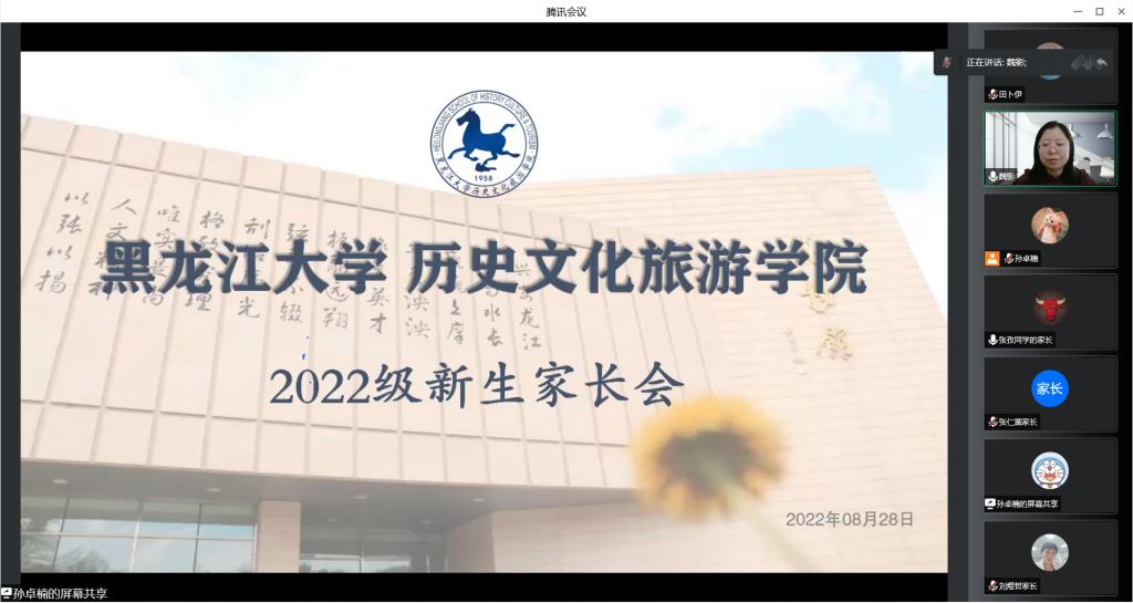 为更好构建学院与家长沟通的桥梁,强化家校共育的理念,推动学院开展新生入学教育和引导新生成长成才,历史文化旅游学院于2022年 8月28日15:00在腾讯会议召开2022级新生家长会。本次会议由2022级辅导员孙卓楠老师主持,历史文化旅游学院党委书记赵恩忠老师、院长魏影老师、党委副书记周丽波老师出席会议,2022级全体新生家长参加。