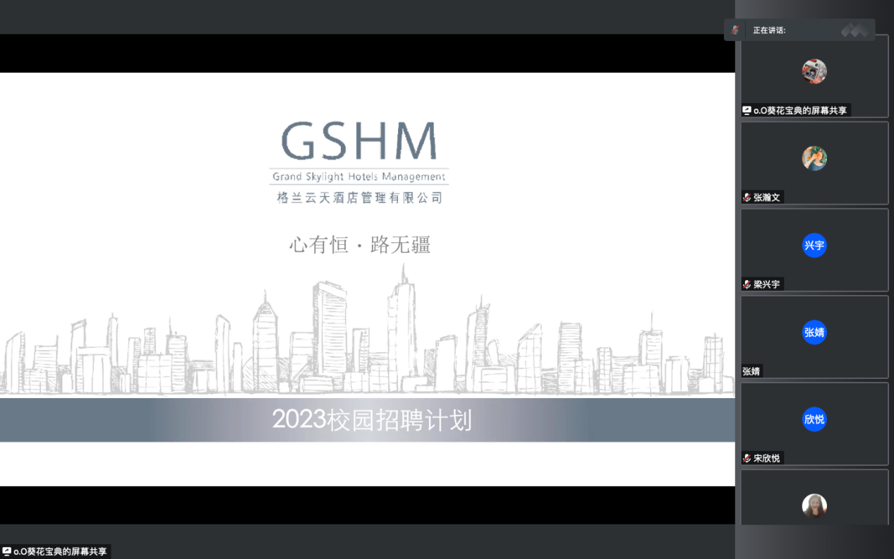 为进一步做好2023届毕业生就业工作,更好地为用人单位和毕业生搭建沟通桥梁,为我院毕业生提供更广阔的就业平台,拓宽毕业生就业渠道,促进毕业生高质量就业,历史文化旅游学院于10月13日晚18:00召开2023届毕业生格兰云天线上专场招聘会。本次招聘会由深圳格兰云天酒店管理有限公司校招负责人傅熙敏主讲,2023届部分毕业生参加。