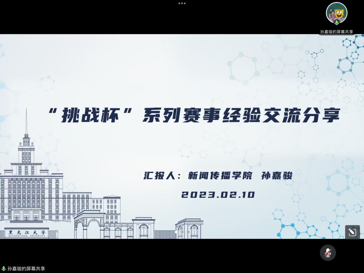 孙卓楠向大家介绍了挑战杯竞赛政策及其要求,挑战杯系列赛事是由共青团中央、中国科协、教育部、中国社会科学院、全国学联共同主办的全国性的大学生课外学术实践竞赛,是一项高水平赛事。本次会议邀请到新闻传播学院2020级学生孙嘉骏向参会人员分享自己的备赛经验,孙嘉骏从挑战杯竞赛的基调、选题、组队、注意事项等多方面进行了讲解,并对与会同学的疑惑进行解答。孙卓楠表示,挑战杯比赛中应该更注重过程,在比赛过程中不断提高自身能力,培养自己的创新和创业意识,并预祝大家取得好成绩。