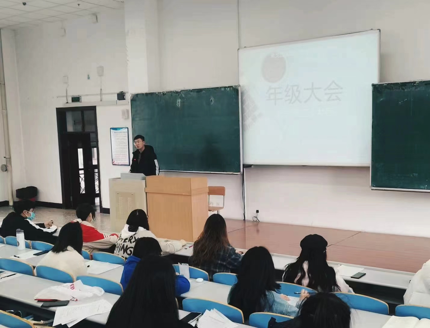 2019级年级大会由辅导员张斯博主持,本次会议主要围绕毕业生的就业问题而展开。会上,张老师鼓励同学们要积极调整好心态、认清就业形势、注意就业安全、积极参加面试、尽快落实单位。同时希望同学们能够顺利完成学业,提前做好本学期规划,珍惜毕业前的时光,为大学生活画上圆满的句号。最后,张老师提醒大家现在是流感高发期,要注意身体,寝室及时通风,做好防护。