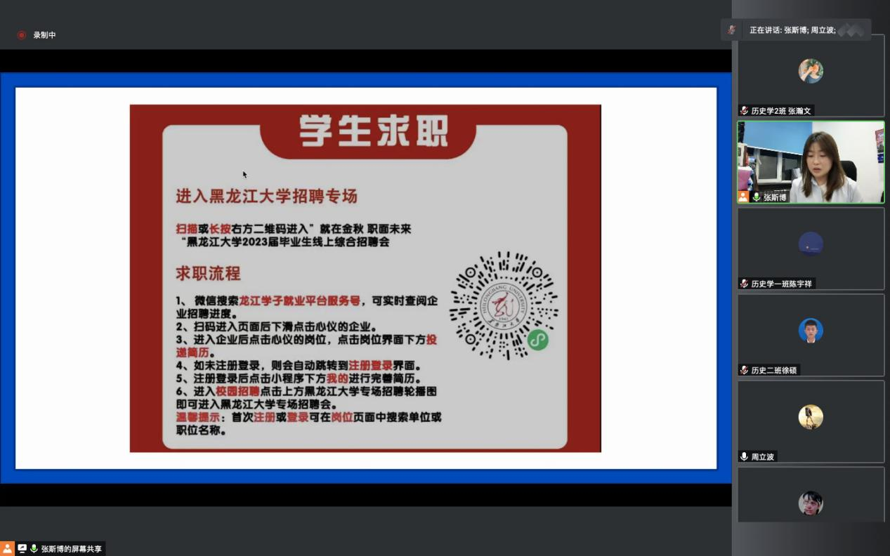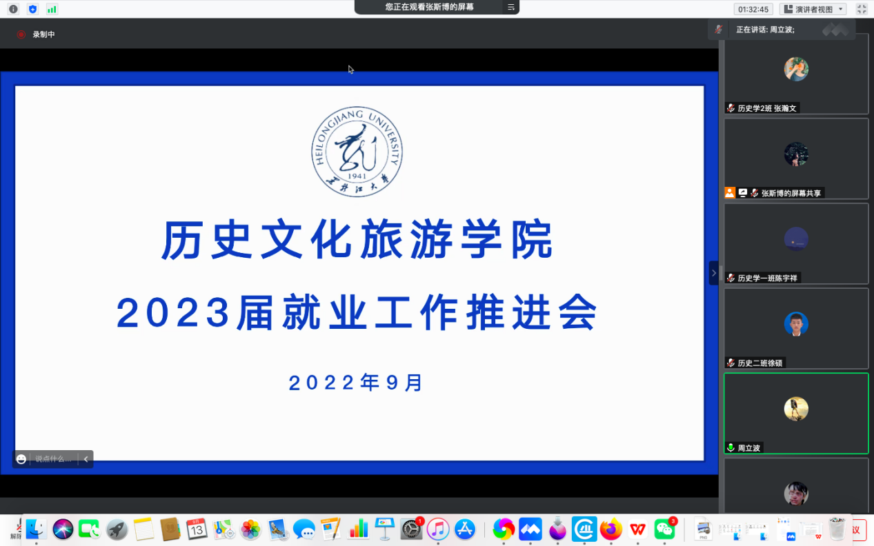 为进一步做好2023届毕业生就业工作,帮助毕业生树立正确就业观和择业观,引导毕业生认清就业形势,加强对毕业生职业规划的指导,促进同学们积极择业、主动就业,切实提高毕业生就业质量,历史文化旅游学院于9月13日晚21:30通过腾讯会议召开2023届毕业生就业工作推进会。本次会议由学院2023届毕业生辅导员张斯博老师主持,学院党委副书记周立波老师出席会议,2023届全体毕业生参加。