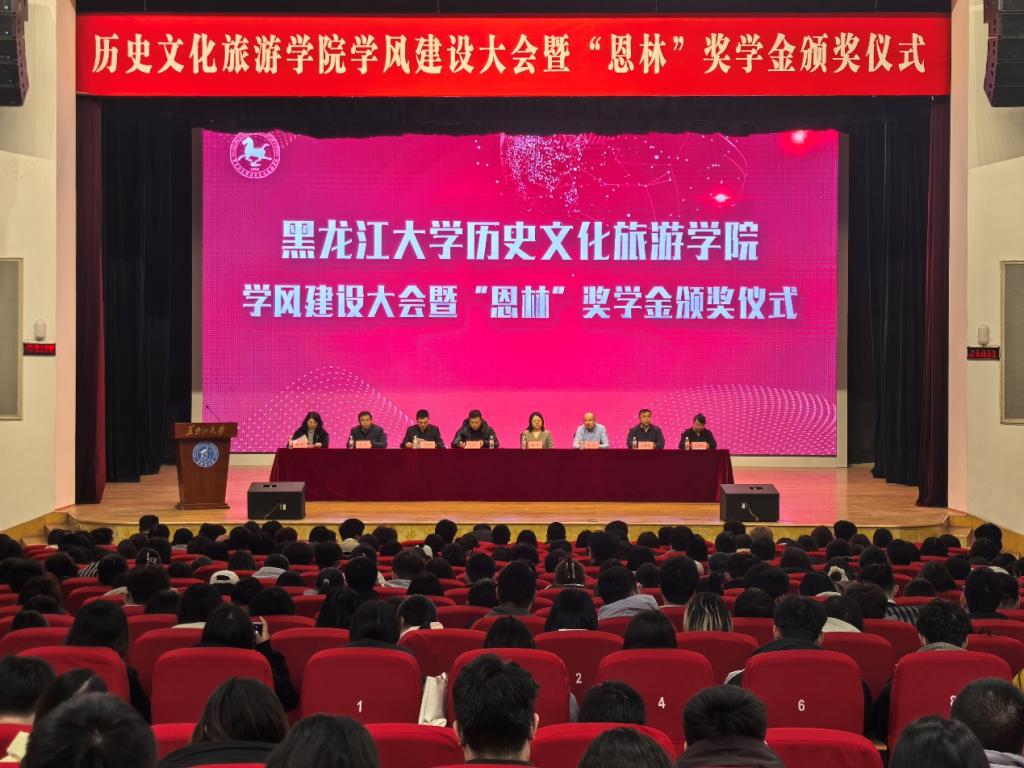 为深入贯彻落实学校全面加强学风建设动员大会精神,全面推进学院优良学风建设,表彰先进,营造好学向上的良好氛围,历史文化旅游学院于3月19日在黑龙江大学音乐厅召开学院学风建设大会暨“恩林”奖学金颁奖仪式。全体院领导、系主任及教师代表、学院全体学生参加会议。大会由学院党委副书记周丽波主持。