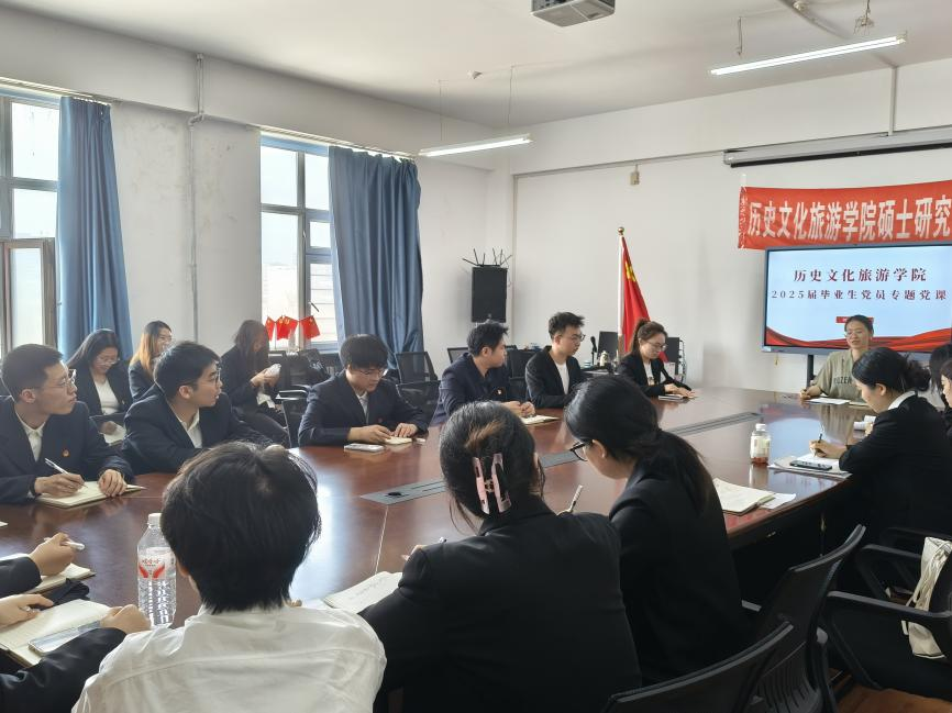 为深入贯彻中央八项规定精神学习教育,进一步强化毕业生党员纪律意识与党性修养,推动中央八项规定精神在青年党员群体中落地见效,历史文化旅游学院于5月30日上午10时在汇文楼723召开2025届毕业生专题党课暨毕业生党员座谈会。本次党课由学院2021级学生党支部书记王佳琪主讲,全体毕业生党员参会。