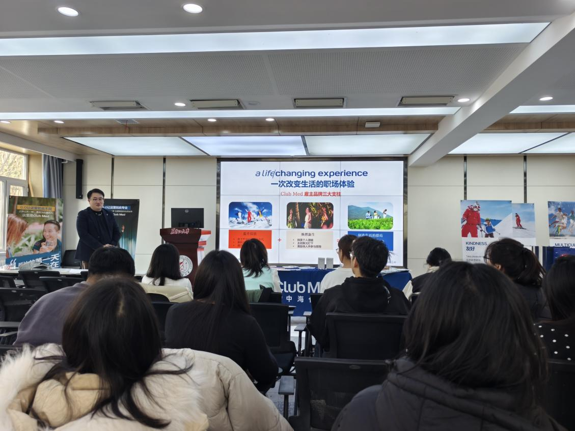 为深入促进高校毕业生高质量充分就业,精准搭建人才供需对接平台,2025年10月28日,历史文化旅游学院与Club Med地中海集团企业开展专场招聘会暨访企拓岗座谈会,学院正处级辅导员苏兆成、旅游管理系主任张丽梅、2026届毕业生辅导员孙卓楠和Club Med地中海集团中国区招聘副经理Adrain和Jam参加会议。