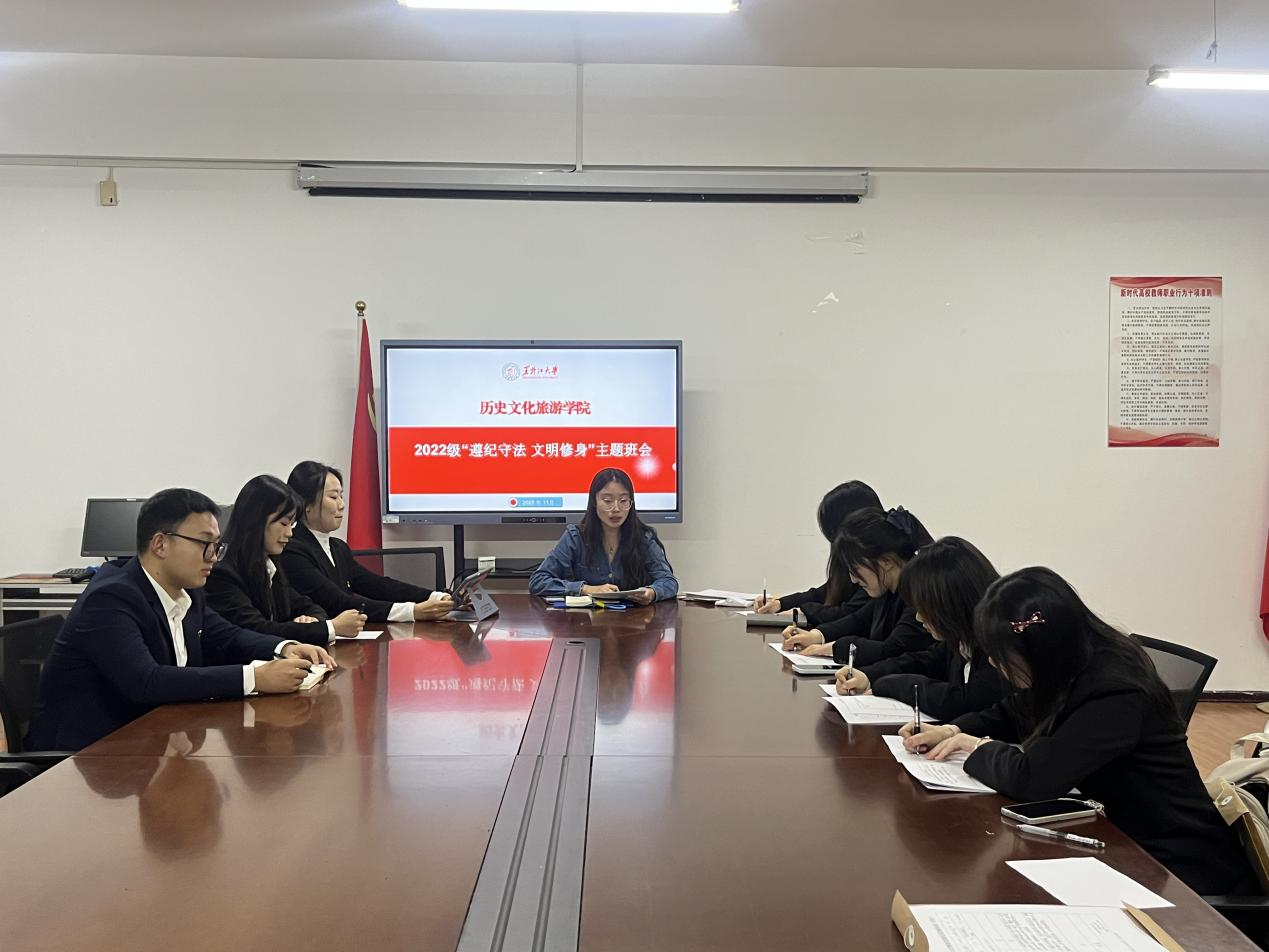 为提高我院学生学习的积极性、主动性,进一步持续深化学院学风建设,切实增强我院学生的反诈防骗意识,筑牢校园安全防线。历史文化旅游学院各班级于11月12日-11月22日召开“遵纪守法,文明修身”主题班会。会议由学院各年级辅导员、各班级班长主持,全体同学参加。