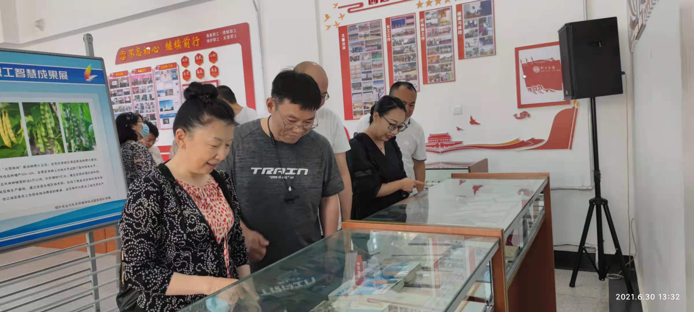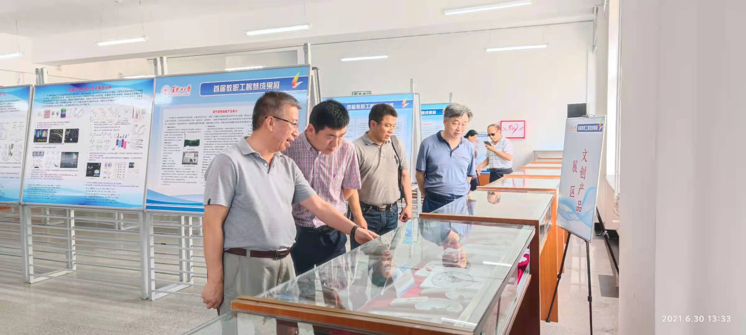 为了庆祝建党100周年、建校80周年,历史文化旅游学院党委于2021年6月30日组织全院教师参观黑龙江大学首届教职工智慧成果展。