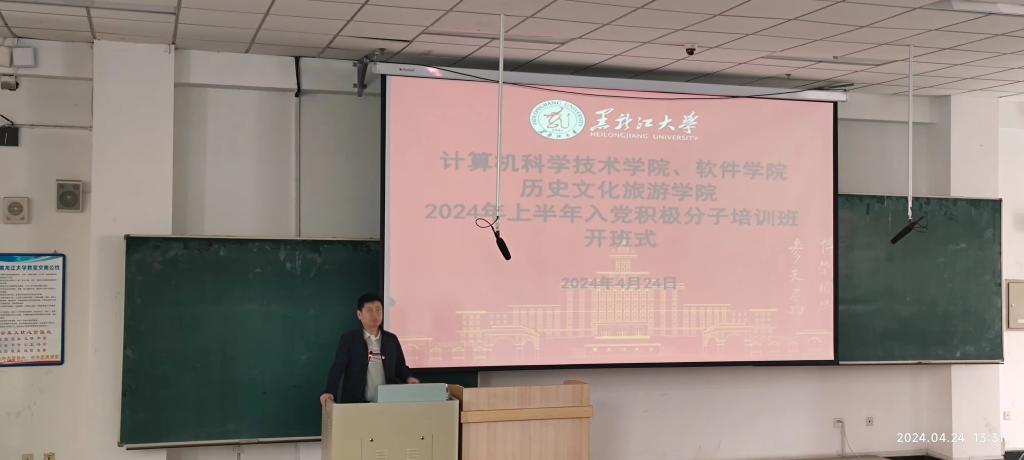 为持续深化能力作风建设“抓基层、打基础、强落实、见实效”活动,稳步提升发展党员工作标准化规范化水平,根据《中国共产党发展党员工作细则》《黑龙江省普通高等学校发展党员工作规程(试行)》要求,计算机科学技术学院、软件学院和历史文化旅游学院于2024年4月24日在汇文楼180教室联合举办2024年上半年入党积极分子培训班开班式。计算机科学技术学院、软件学院党委副书记张立才、历史文化旅游学院党委副书记周丽波出席开班式,共160余名入党积极分子参加开班式。