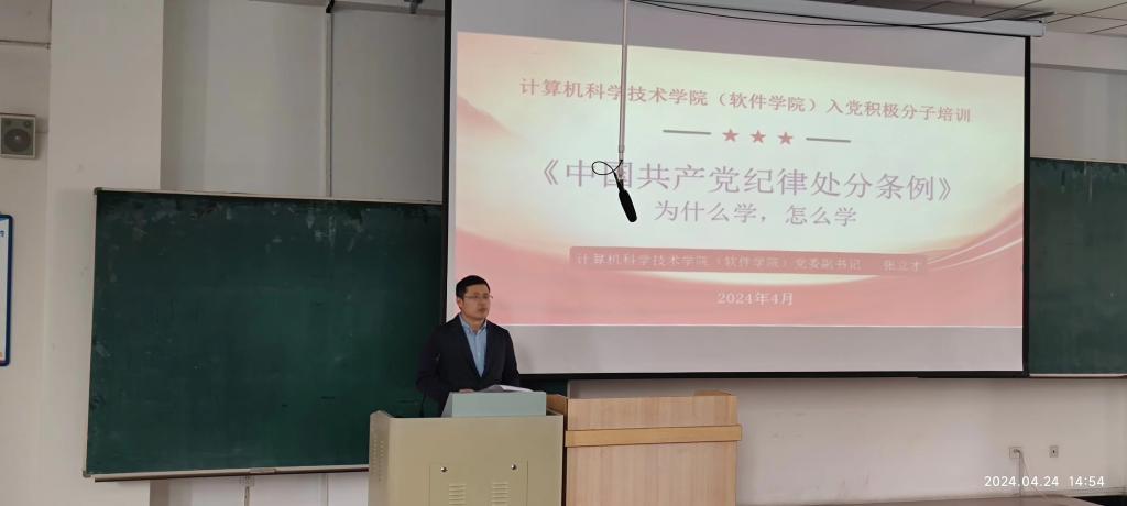 开班式后,计算机科学技术学院、软件学院党委副书记张立才以“入党积极分子为什么学《中国共产党纪律处分条例》,怎么学?”为主题,从《条例》修订的背景、意义和突出特点等方面切入,对《条例》内容进行了深入详细解读,教育引导入党知识分子要深刻感悟习近平总书记关于推进党的自我革命、健全全面从严治党体系、全面加强党的纪律建设的新思想新论断新要求,进一步深入理解和把握《条例》修订的内涵意义和实践要求。张立才强调,入党积极分子要以党员标准严格要求自己,把学习和贯彻好《条例》作为当前重要政治任务来抓,原原本本学、逐章逐条学,自觉将严明的纪律转化为推动学习工作的保障。